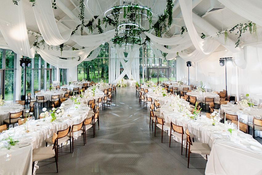 Абсолютно новый зал для мероприятий — светлый, просторный и атмосферный. В окружении леса и пруда, с панорамными окнами и террасой под открытым небом.